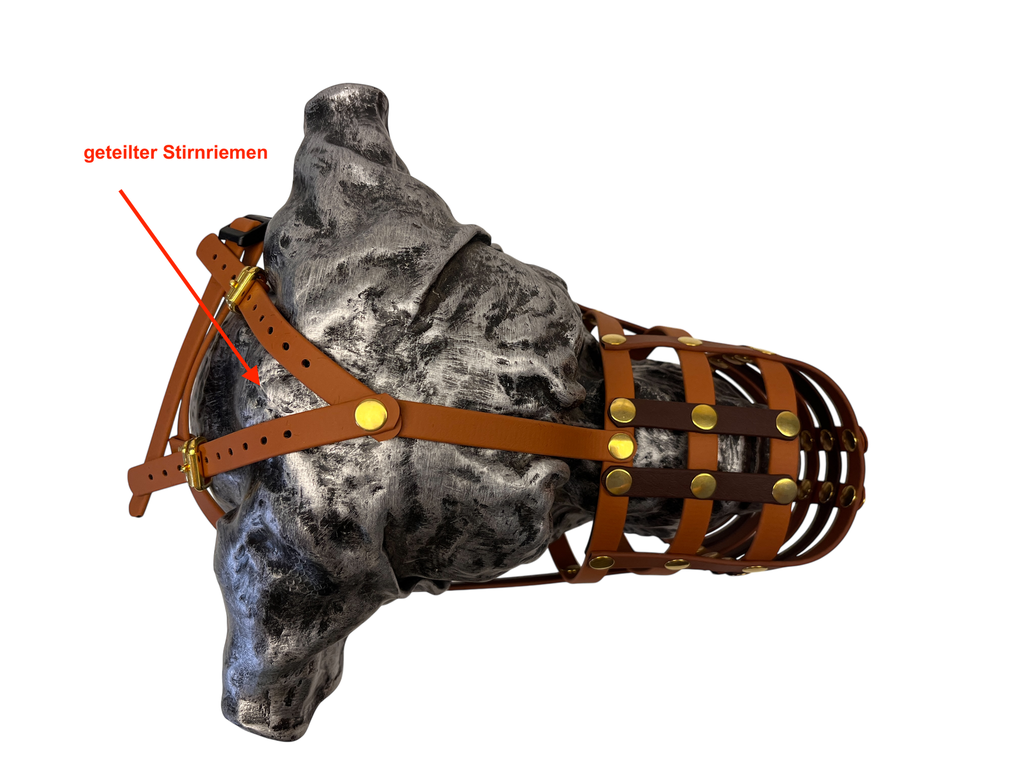 Ein geteilter Stirnriemen bei einem Maulkorb dient dazu, den Maulkorb am Hund zu befestigen und ein Abstreifen oder Verrutschen zu verhindern, besonders wenn der Maulkorb nicht optimal passen sollte oder der Hund versucht, ihn mit den Pfoten abzuziehen. Ein geteilter Stirnriemen sorgt für einen sicheren Halt und kann die Passform des Maulkorbes verbessern, indem er zusätzlichen Halt bietet. Durch den sicheren Halt wird verhindert, dass der Maulkorb in die Augen rutsch und dadurch das Sichtfeld beeinträchtigt wird.